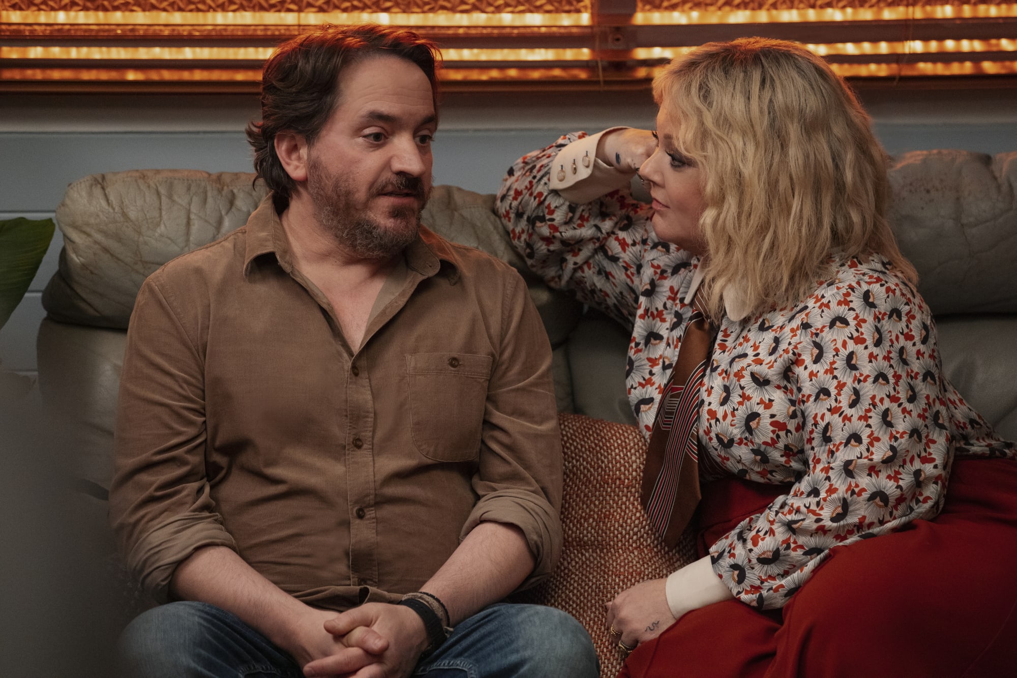 L’idiot préféré de Dieu. (De gauche à droite) Ben Falcone comme Clark Thompson, Ana Scotney comme Wendy, Usman Ally comme Mohsin Raza, Melissa McCarthy comme Amily Luck, Chris Sandiford comme Tom dans l’épisode 103 de God’s Favorite Idiot. Cr. Vince Valitutti/Netflix © 2022
